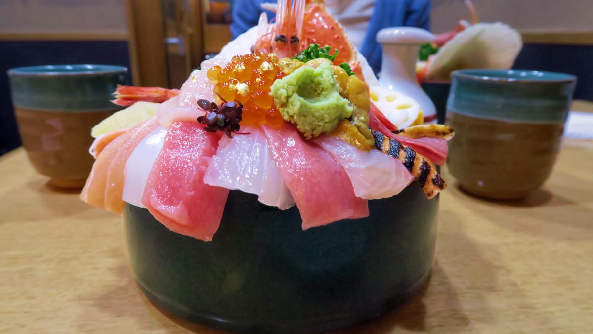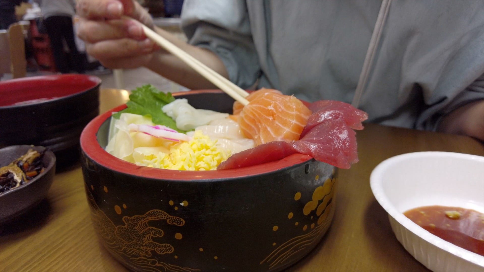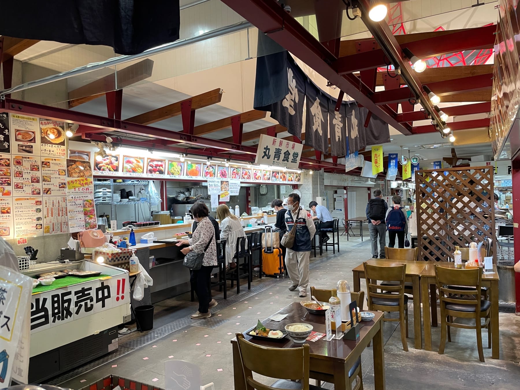 Drei kleine Restaurants sorgen dafür, dass die Besucher ihren Hunger sofort stillen können. Ich habe im Maru Ao Shokudo gegessen. Man kann sich hier am langen Tresen oder an einem der vielen Tische gemütlich machen. Das Restaurant ist für sein Kaisendon bekannt (siehe Foto unten). Dabei handelt es sich um frischen Fisch und Meeresfrüchte auf Reis. Auch Thunfischvariationen (siehe Titelfoto), lokale Spezialitäten und sogar Curry stehen auf der Speisekarte. Der AUGA Shinsen Ichiba öffnet täglich um 5 Uhr morgens. Damit ist er die perfekte Anlaufstelle für ein leckeres Frühstück.
