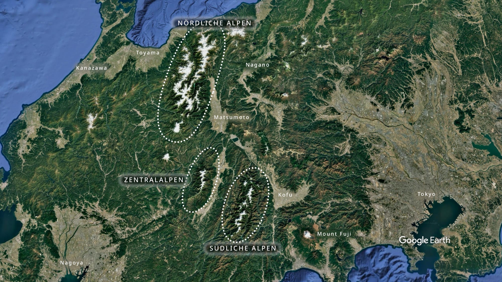 - Die Japanischen Alpen bestehen aus drei Gebirgsketten im Herzen der Hauptinsel Honshu: den Nordalpen (Hida-Gebirge), den Südalpen (Akaishi-Gebirge) und den Zentralalpen (Kiso-Gebirge).
