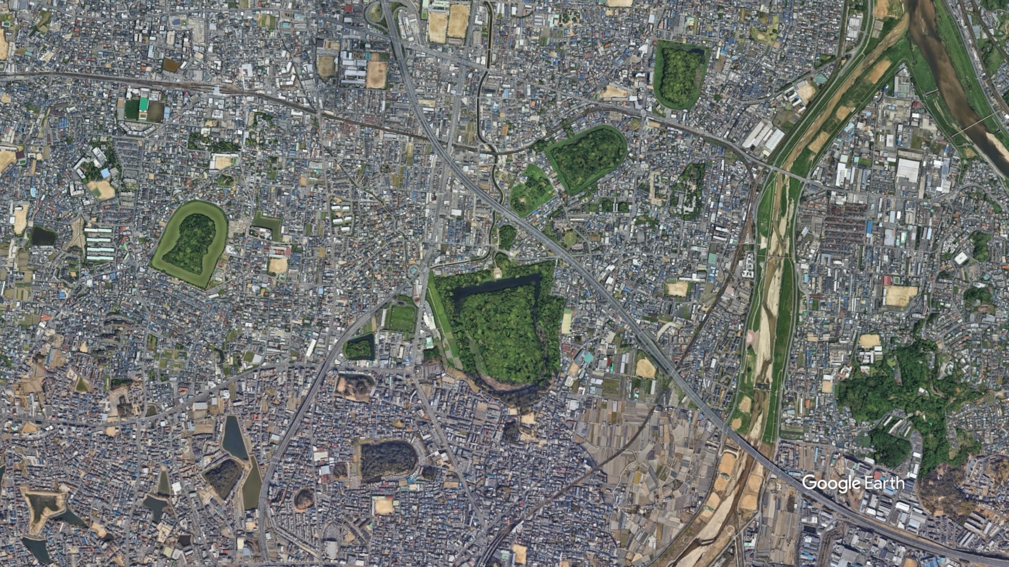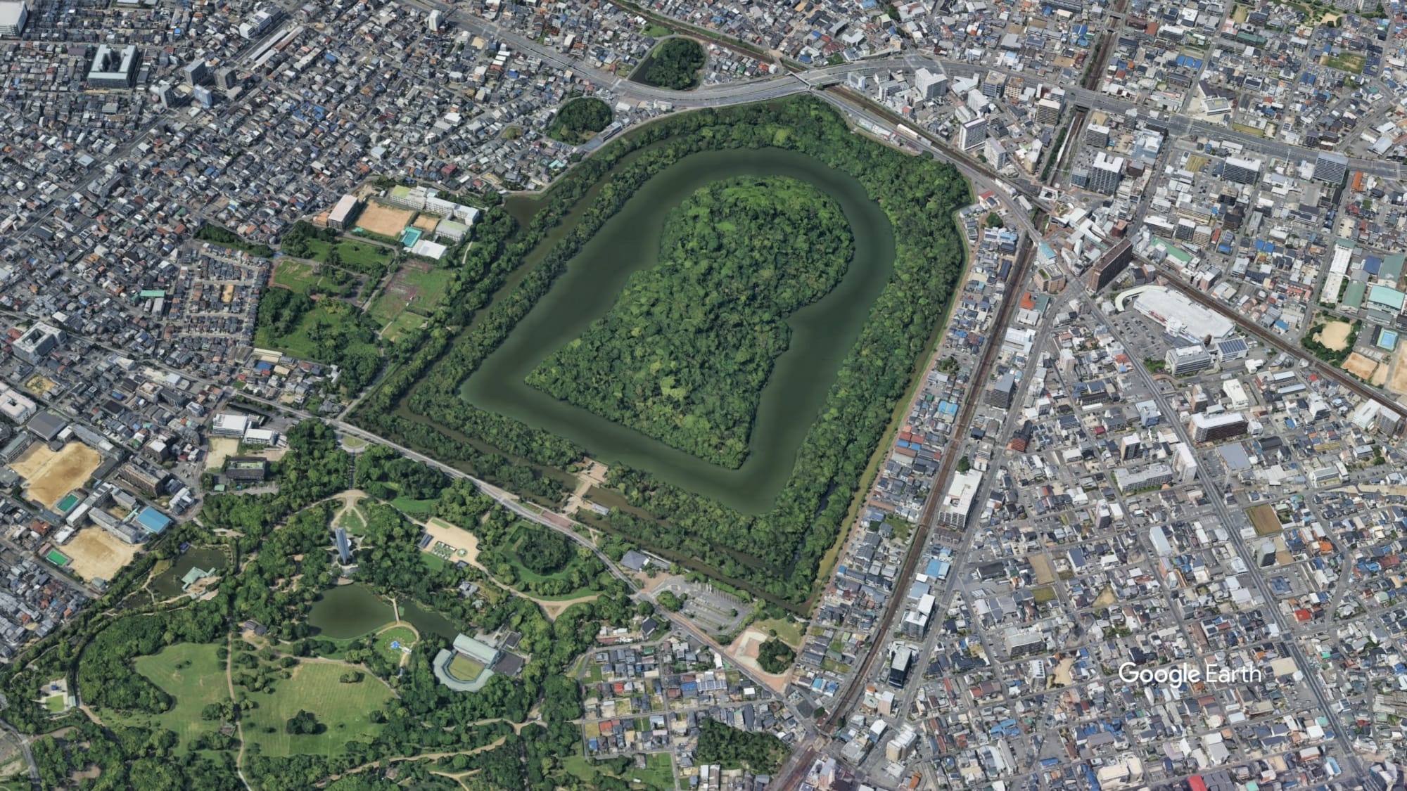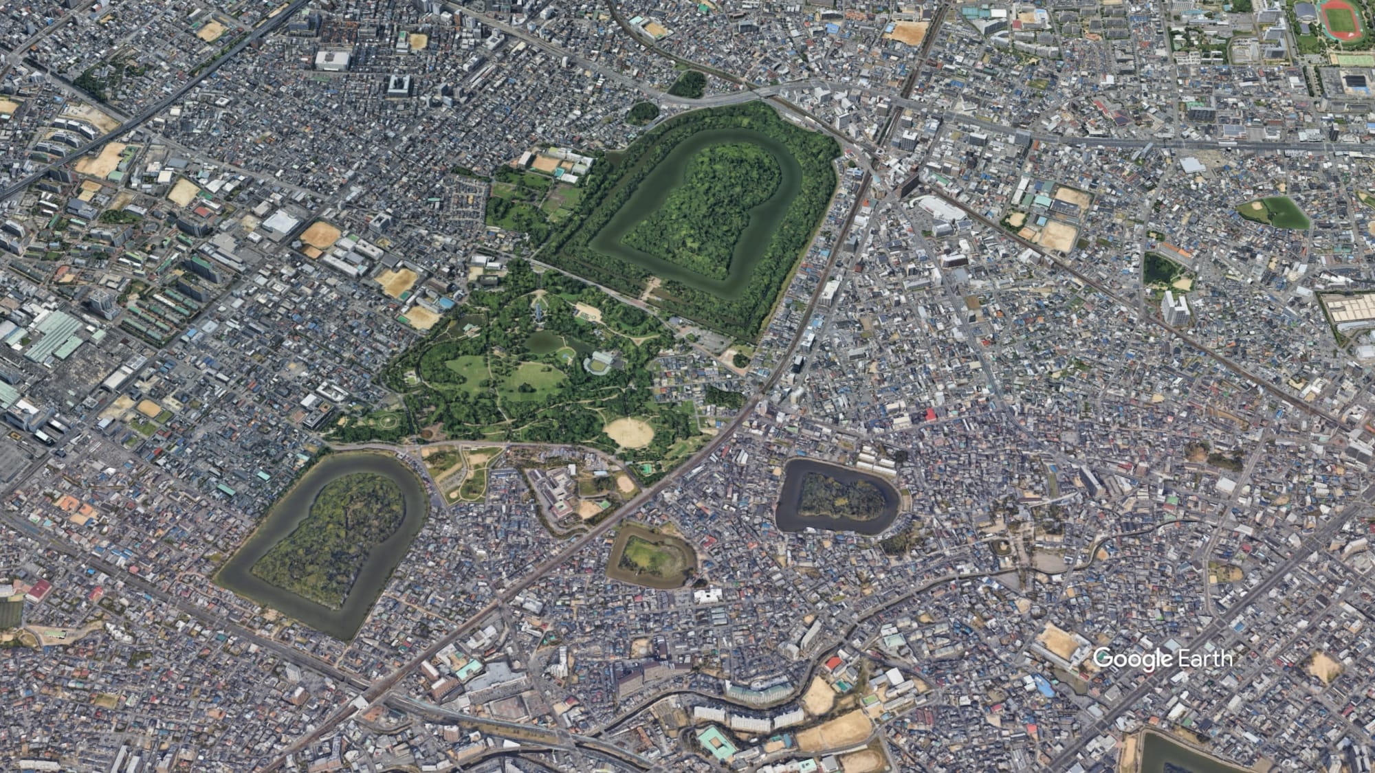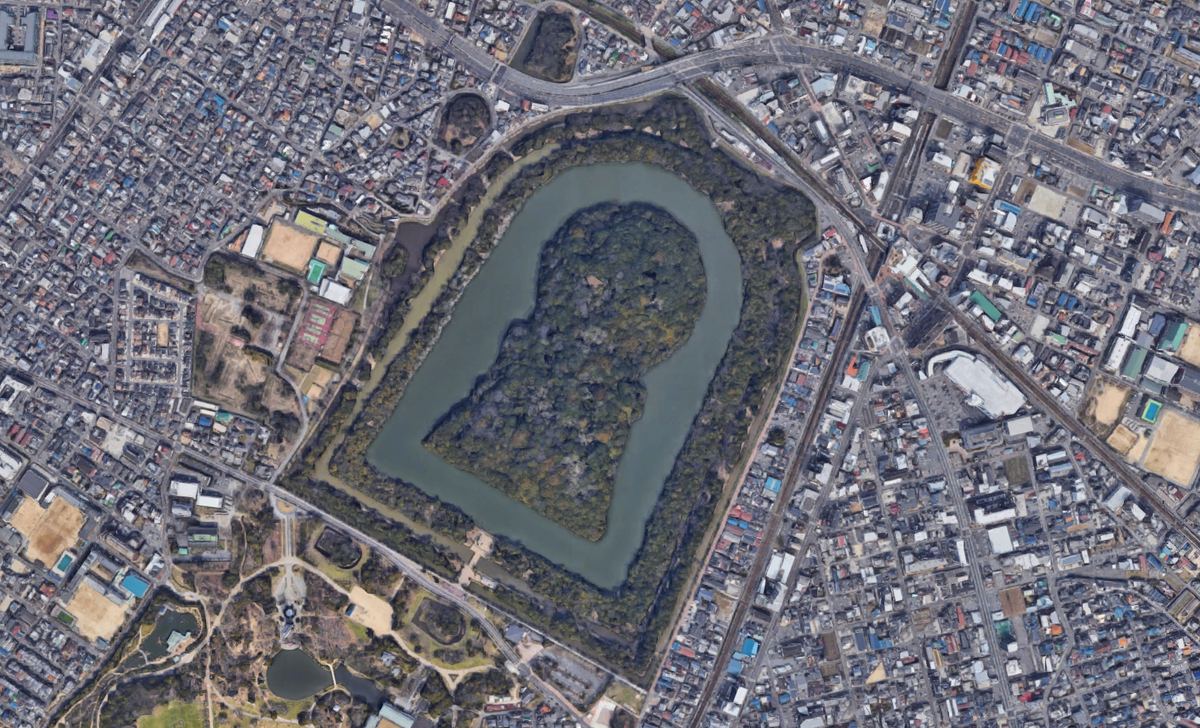 Das Daisen Kofun und die umliegenden Hügelgräber in Sakai. Google Earth